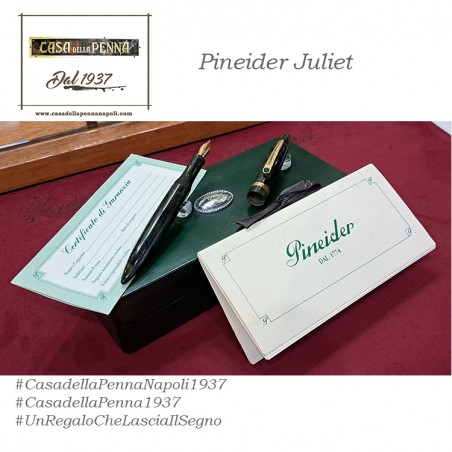 Dettagli: Clip lineare laminato in oro con pietra di colore verde a incastro nella clip; penna con forma a ogiva; Alla base del cappuccio c'è una fascetta laminato in oro con inciso il nome Juliet; incisione Pinaider sul corpo della penna con il numero della serie numerata 782 su 998