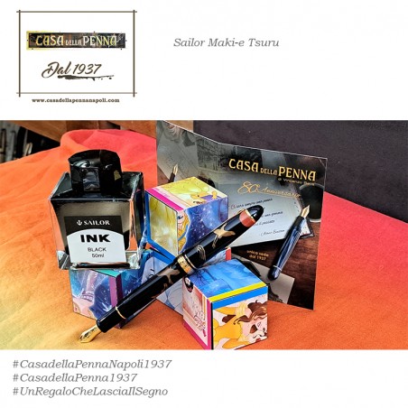 Stilografica Tsuru della collezione 1911 Standard Maki-e Series 2014. Modello interamente in resina nera con decori manuali della tradizione giapponese in lacca urushi Maki-e. Finiture dorate, pennino 14 Kt, caricamento a converter.